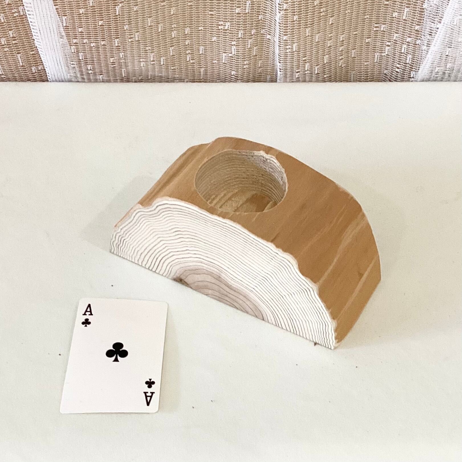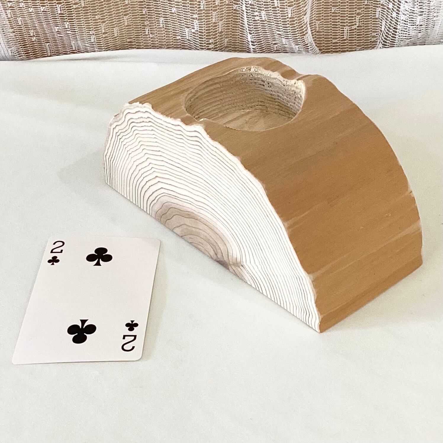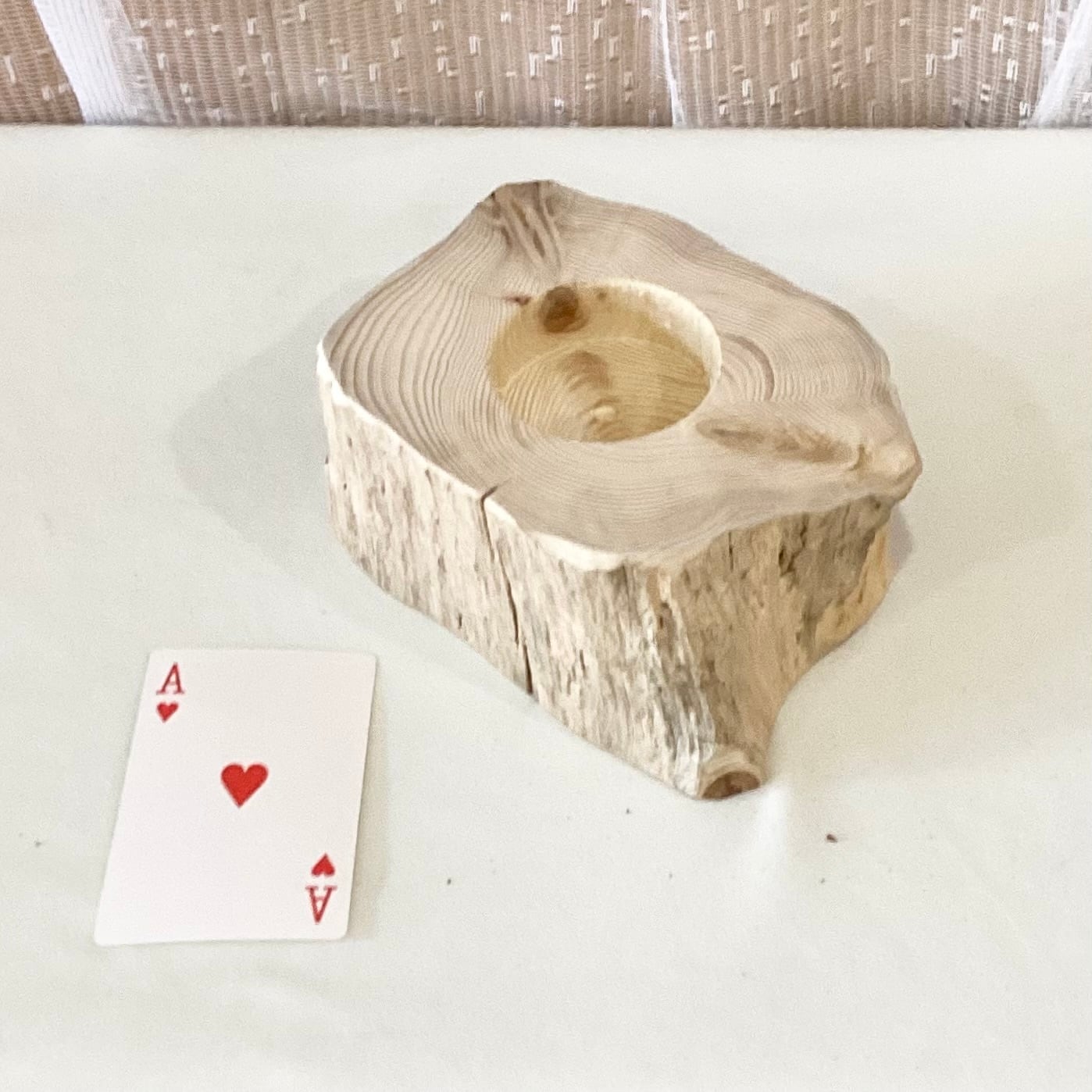 太枝を半切りにした台では、やや穴が深いため、花瓶等の胴の部分が、直径55mm以上では、つかえてしまう場合がありますので、ご注意ください。