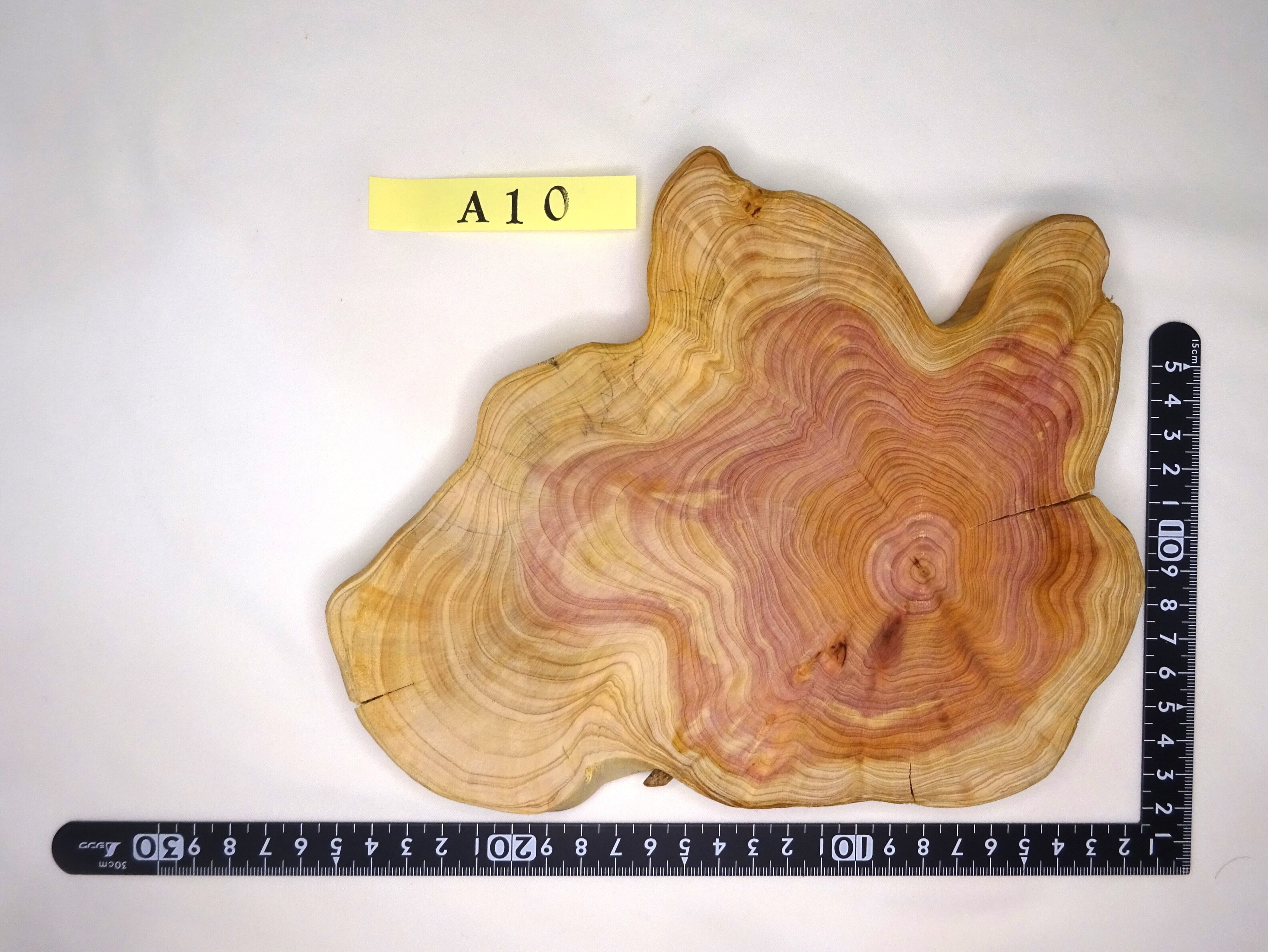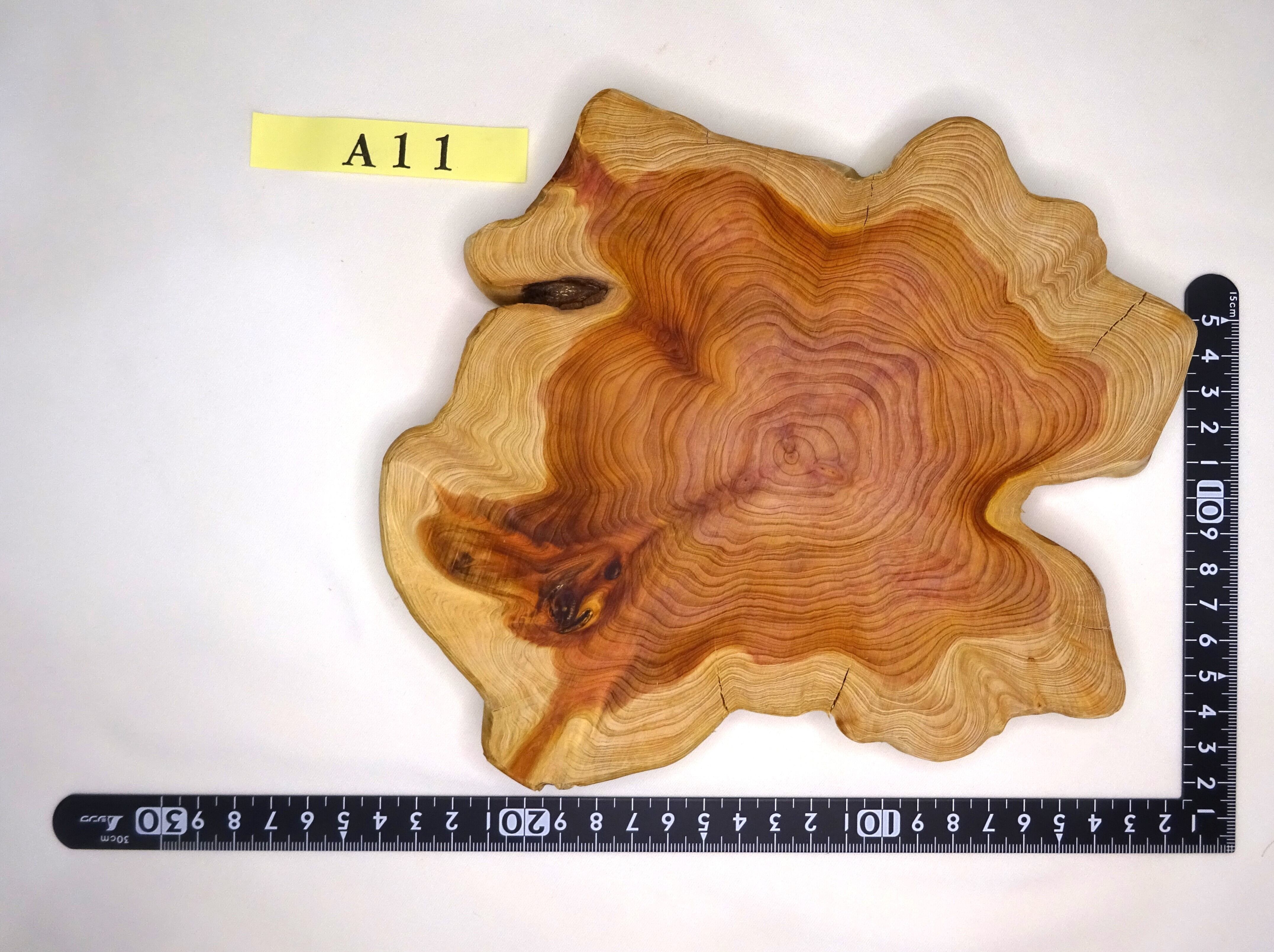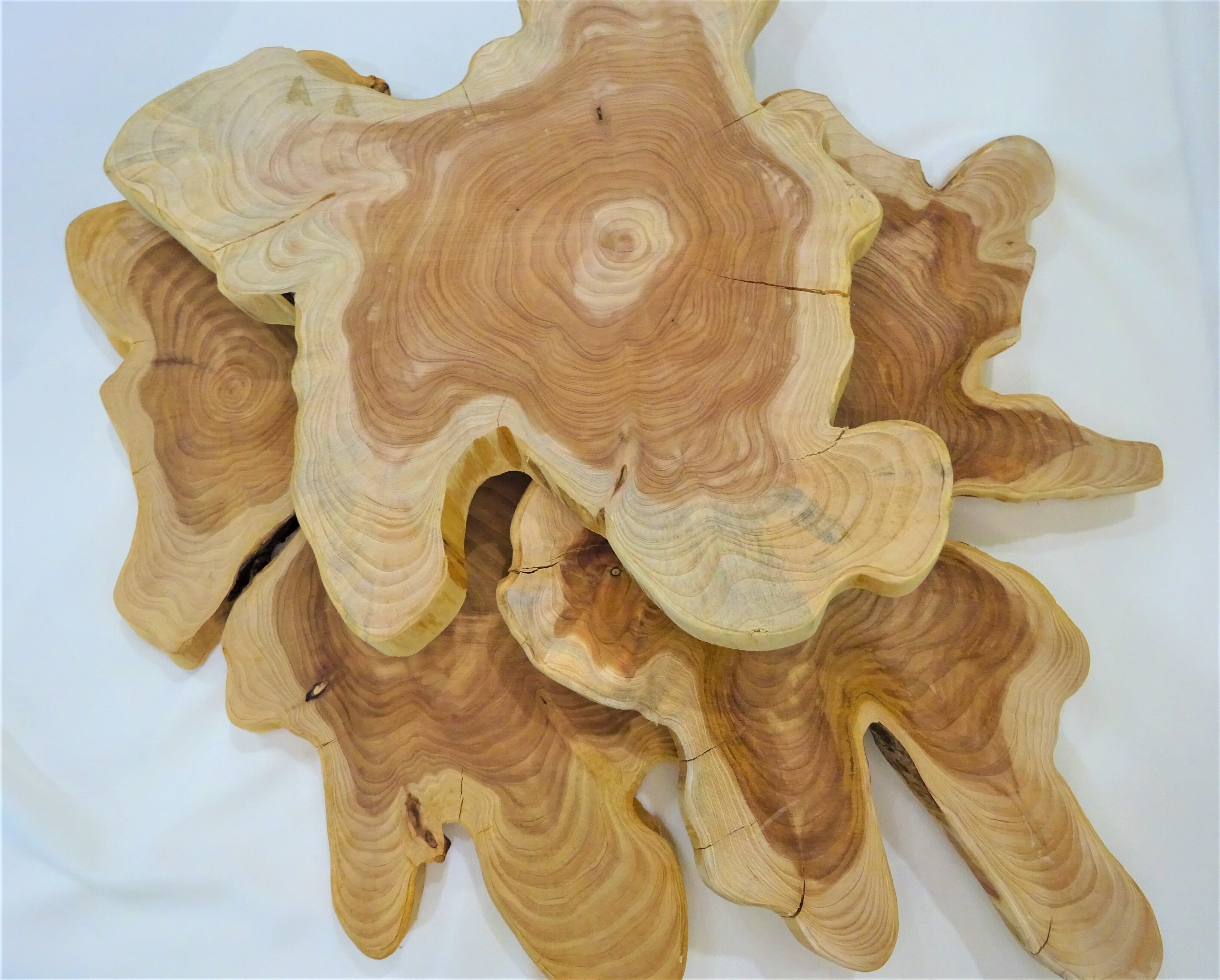 奈良県吉野産のイブキの幹を輪切りにしました。天然ものなので、形がそれぞれ異なります。また、木の性質上、ヒビが入りやすいので。大小幾つかヒビが入っています、写真でお確かめいただければと思います。これも、その木の特徴と見ていただければ幸いです。