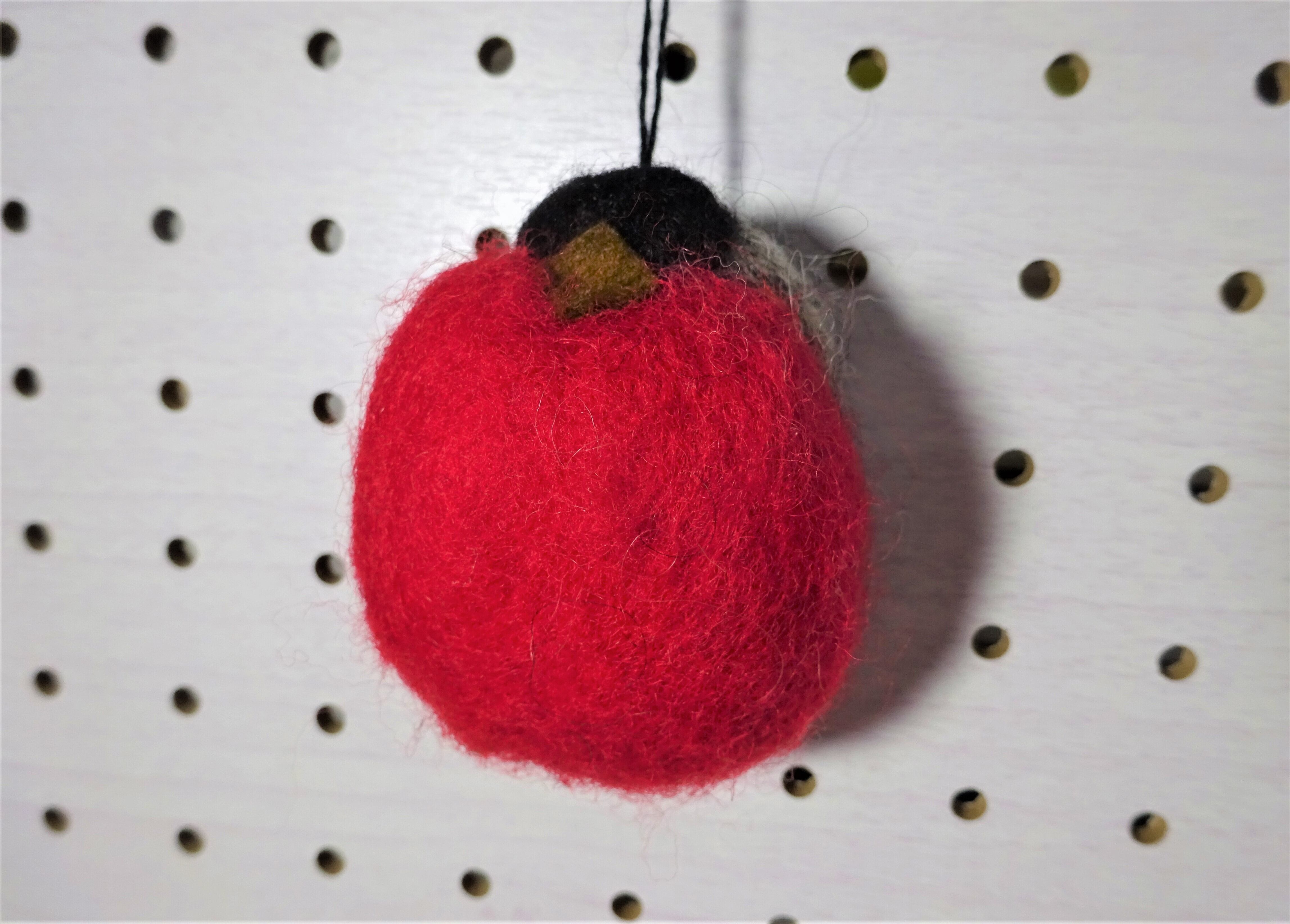 ウール製のオーナメントです。まあるいとりで、お腹か真赤です。つばさがグレーで、くちばしがブラウン、頭と背中がブラックです。