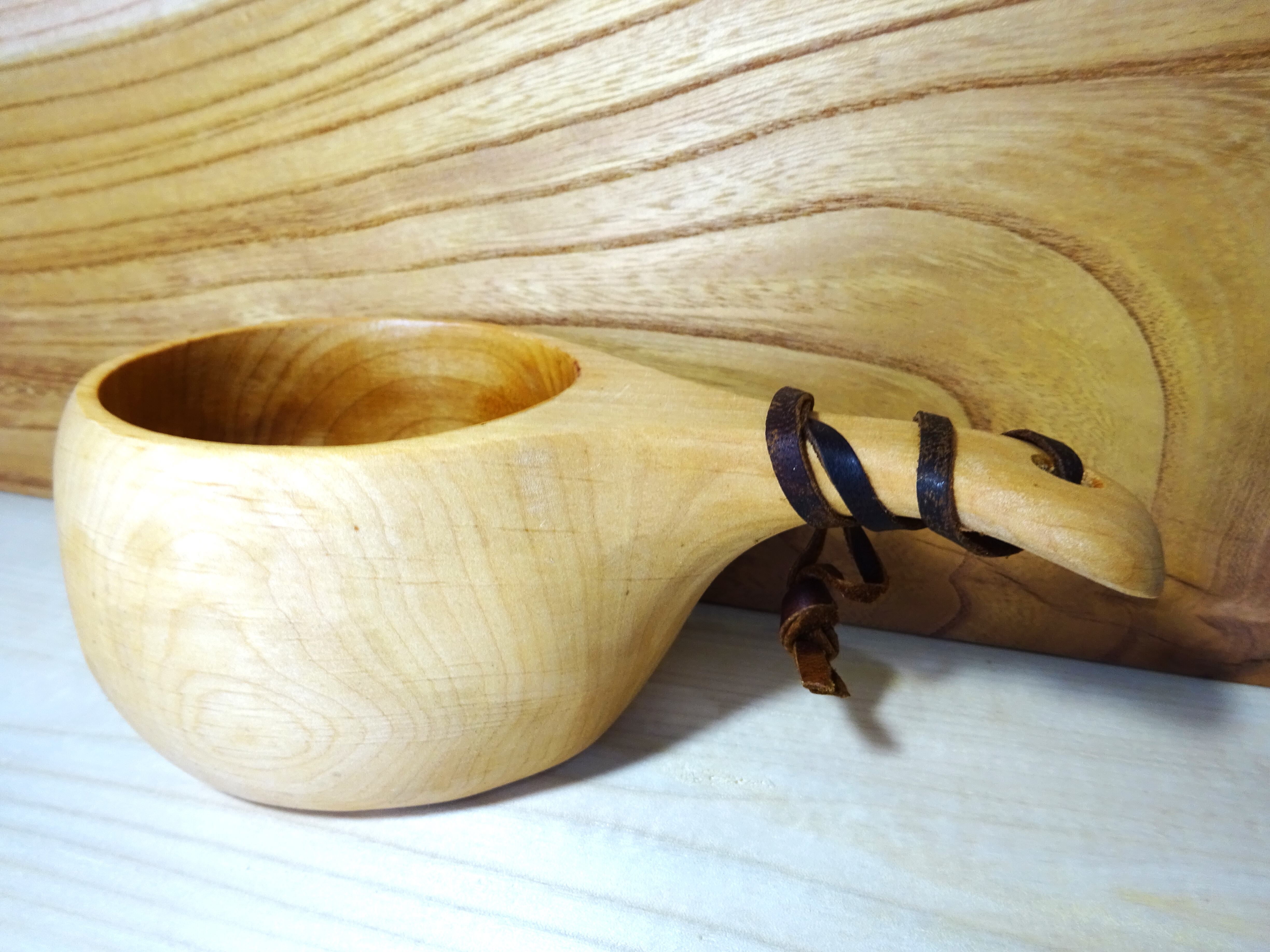 スウェーデンの木製マグカップ・ククサのご紹介です。本来は白樺のこぶの塊からつくられますが、原材料不足から他の素材からつくられることも多くなりました。本品は、ハナノキ製の手仕事品となり、把手に皮ひもがついています。手仕事のため、多少大きさにばらつきはありますが、おおよそ、