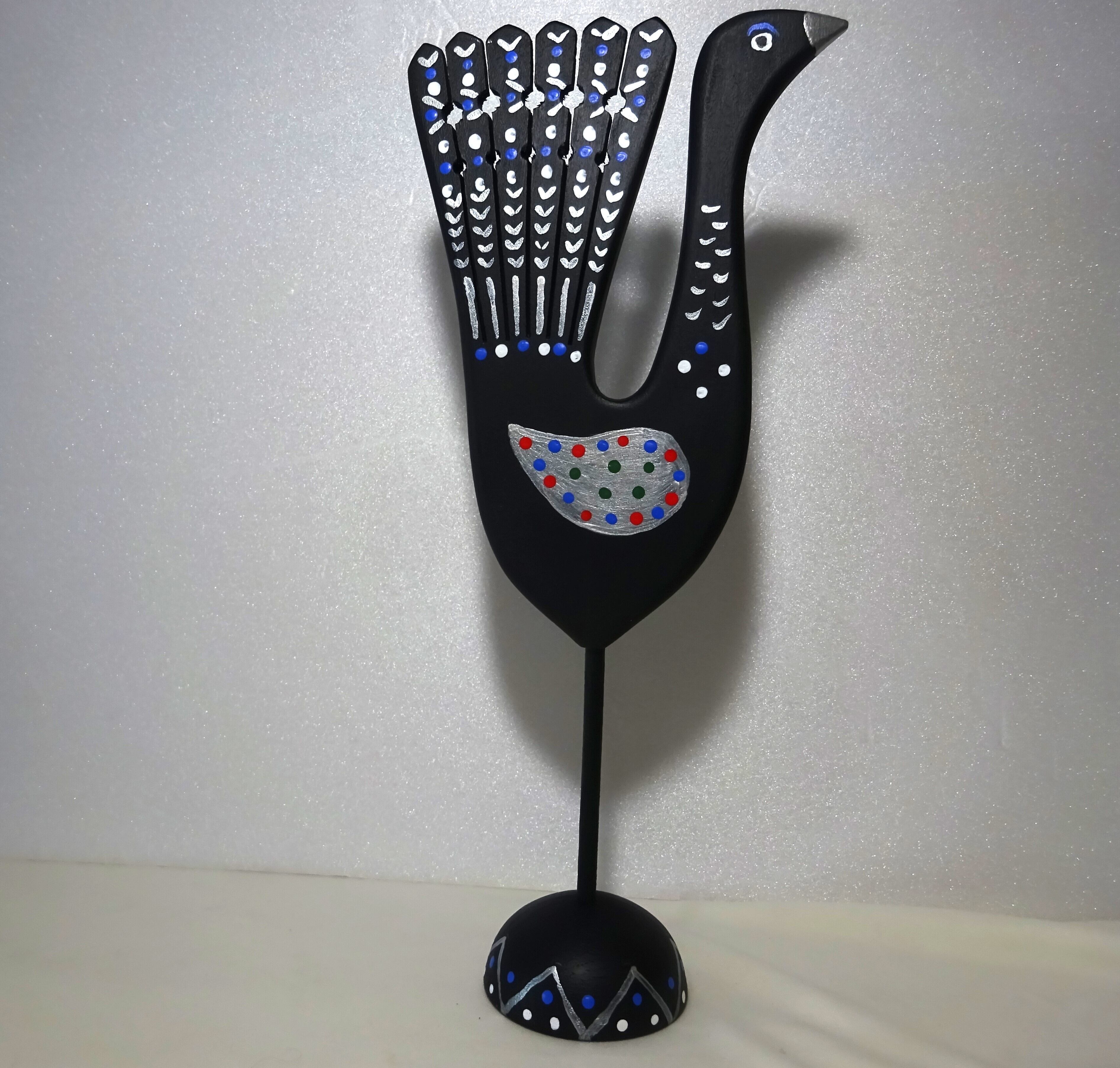 スウェーデンのオーケル・アンダショさんの鳥の木製オブジェで、高さおよそ31cmです。