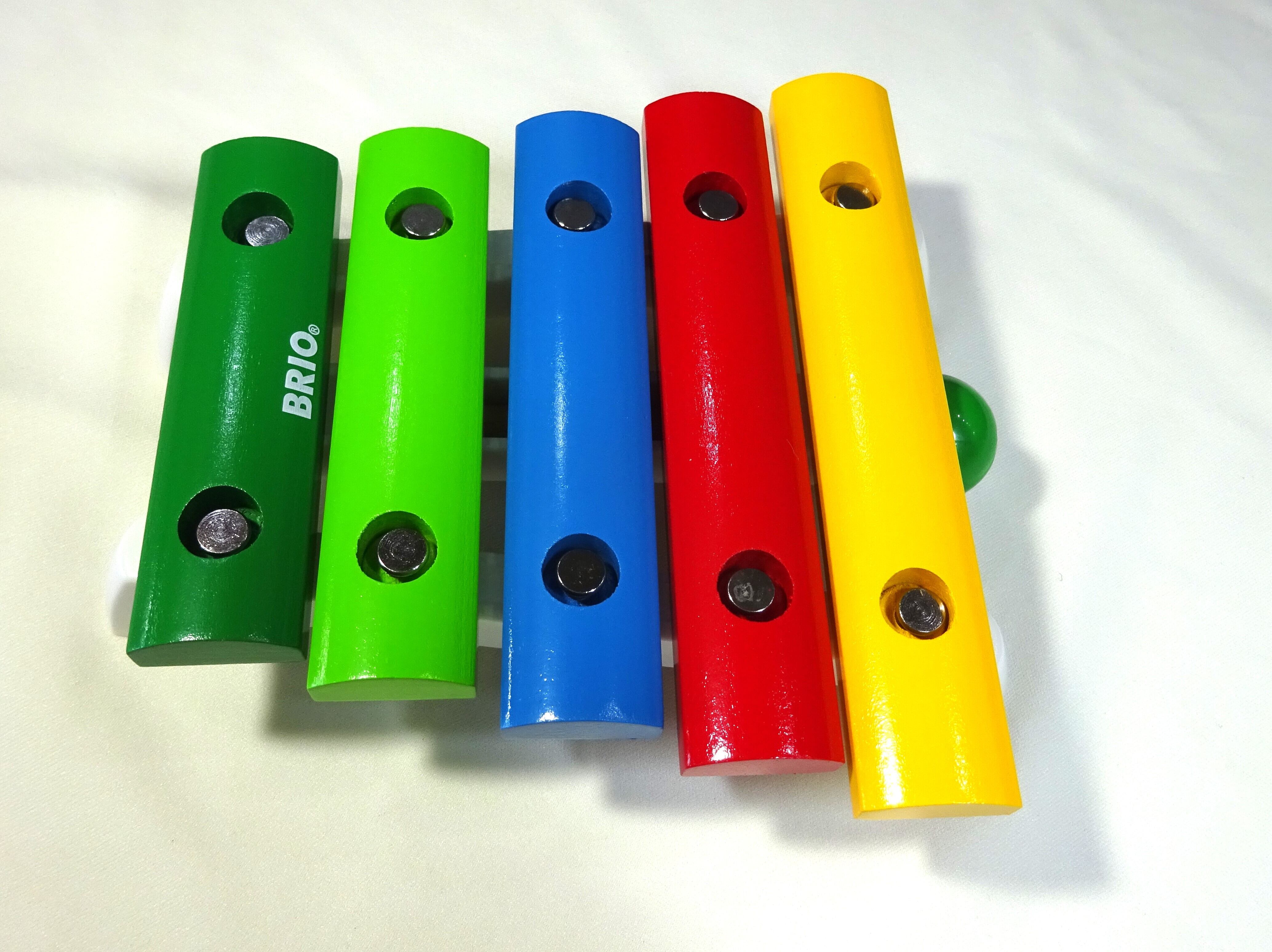 木琴で新しい作品を作ってみませんか。5つの音の鍵盤はそれぞれ違うトーンで新しいメロディをつくることができます。スティックは、本体に収納ができます。家族みんなで音楽を楽しんでみてはいかがでしょうか。