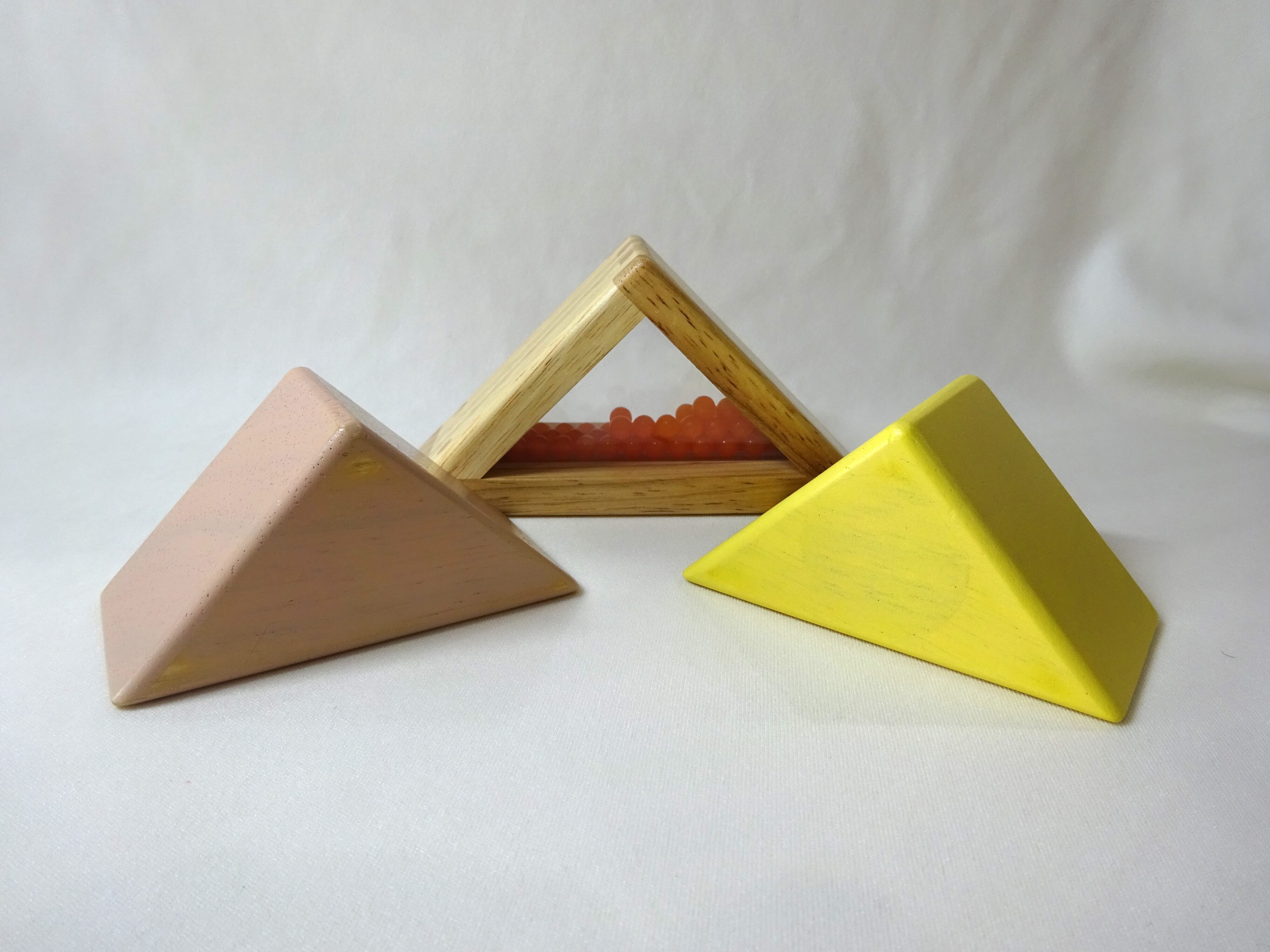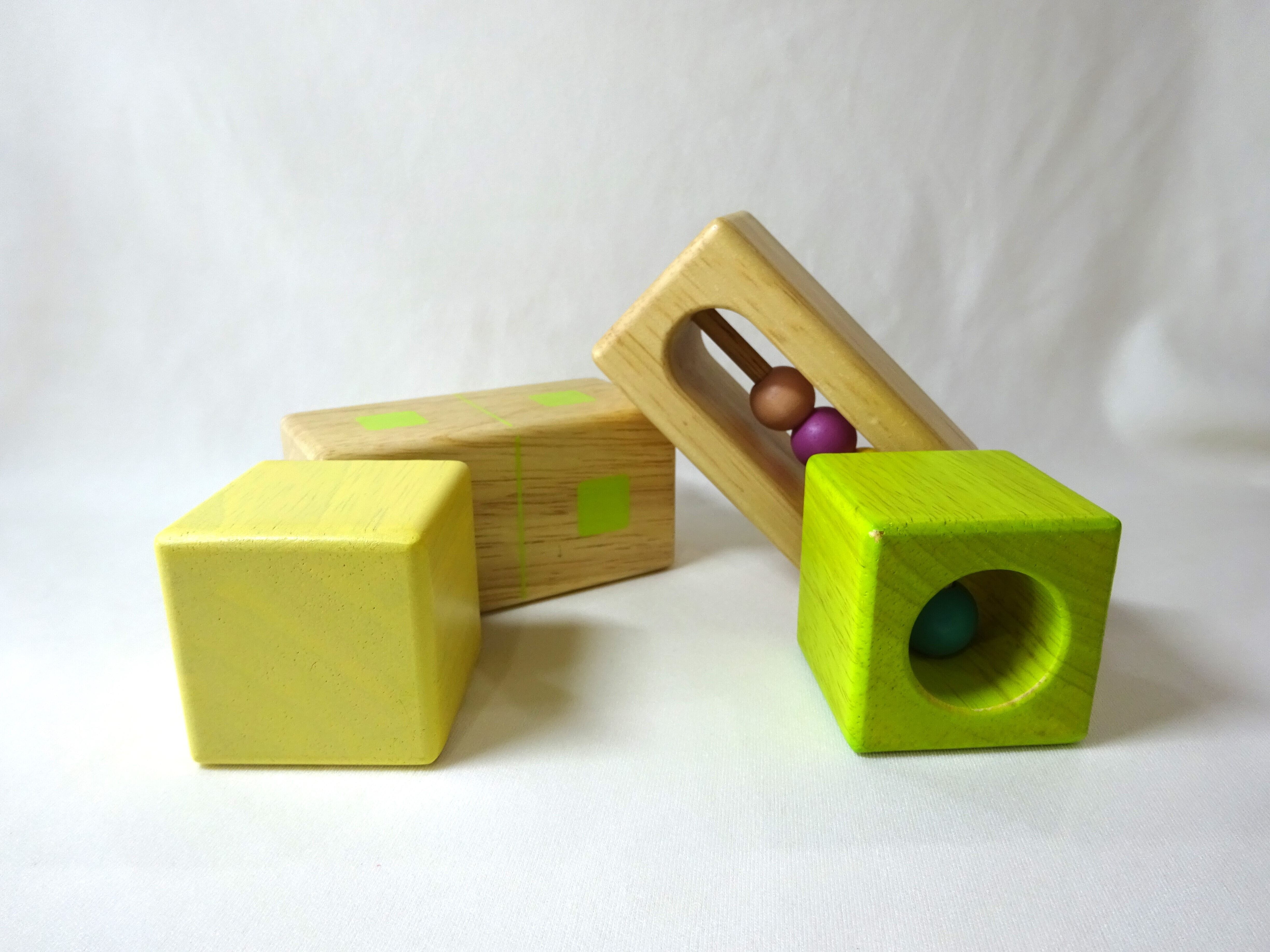 11個のつみき、全て音がなります。さんかく、しかく、えんちゅうの3種類のつみきは、小さなお子様向けに、軽く、もちろん角もなめらかになっています。