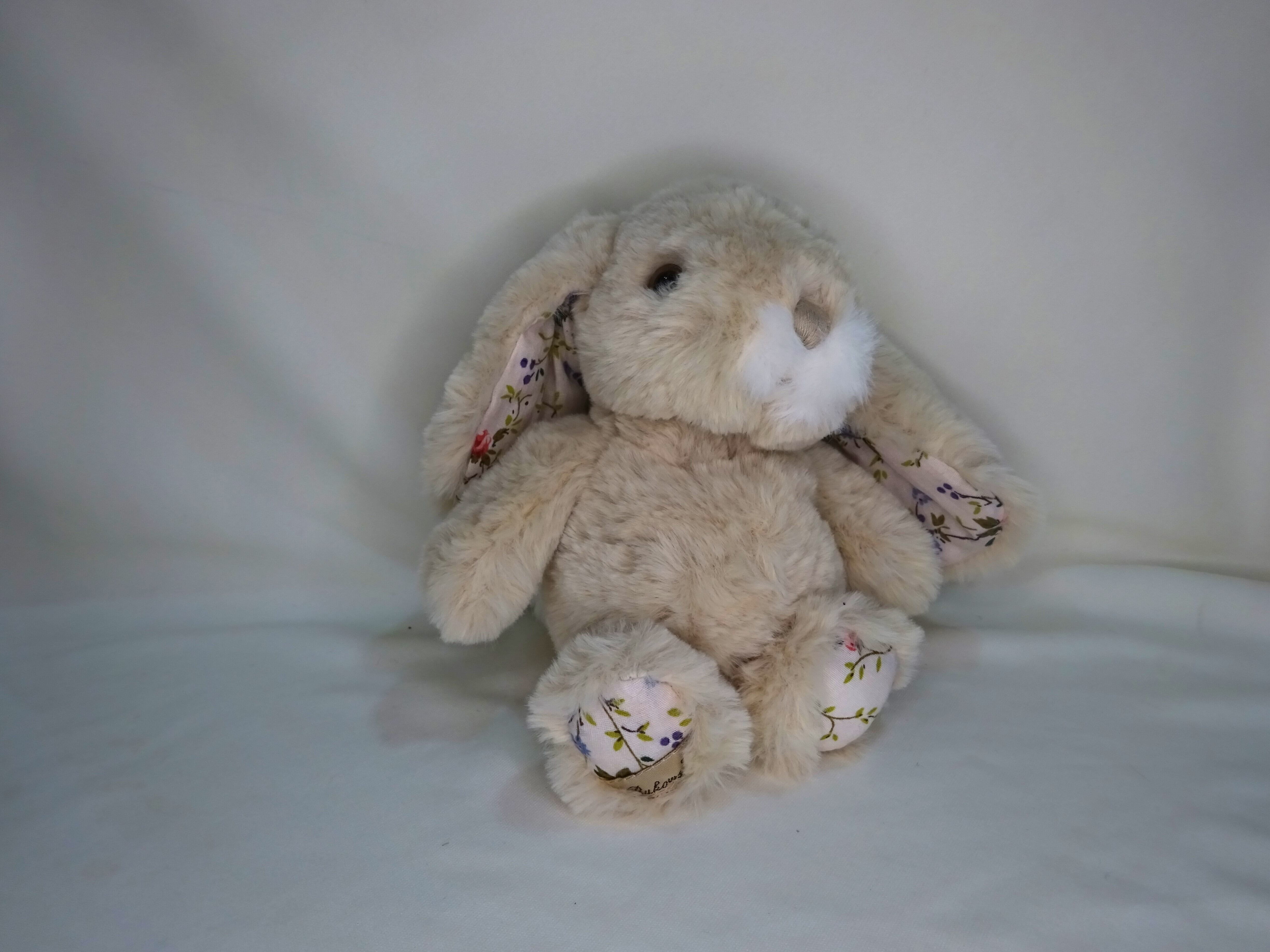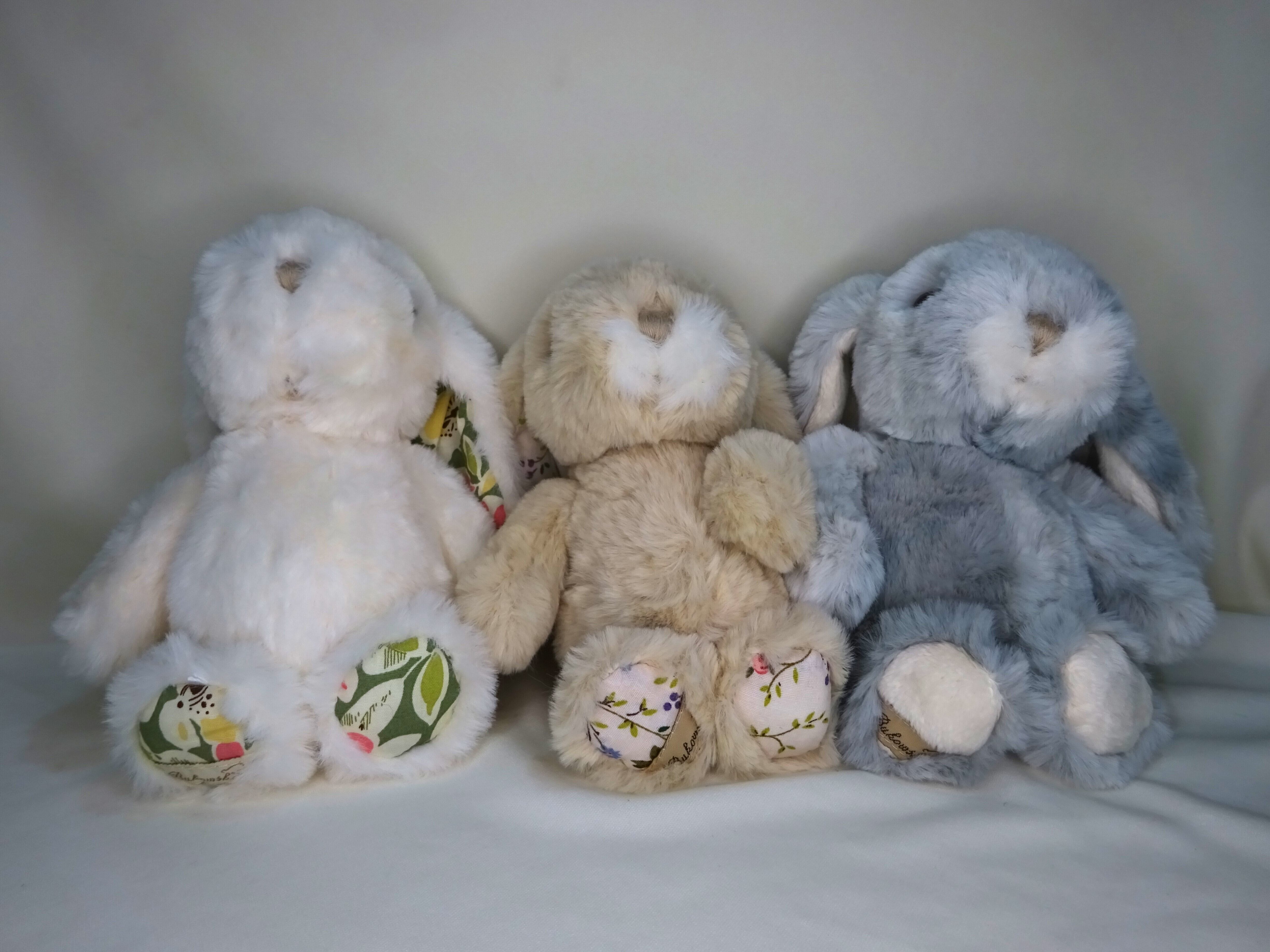 手づくりのため、一体一体表情や耳・足裏の柄等が多少異なります。また、無地のバニーもいます。