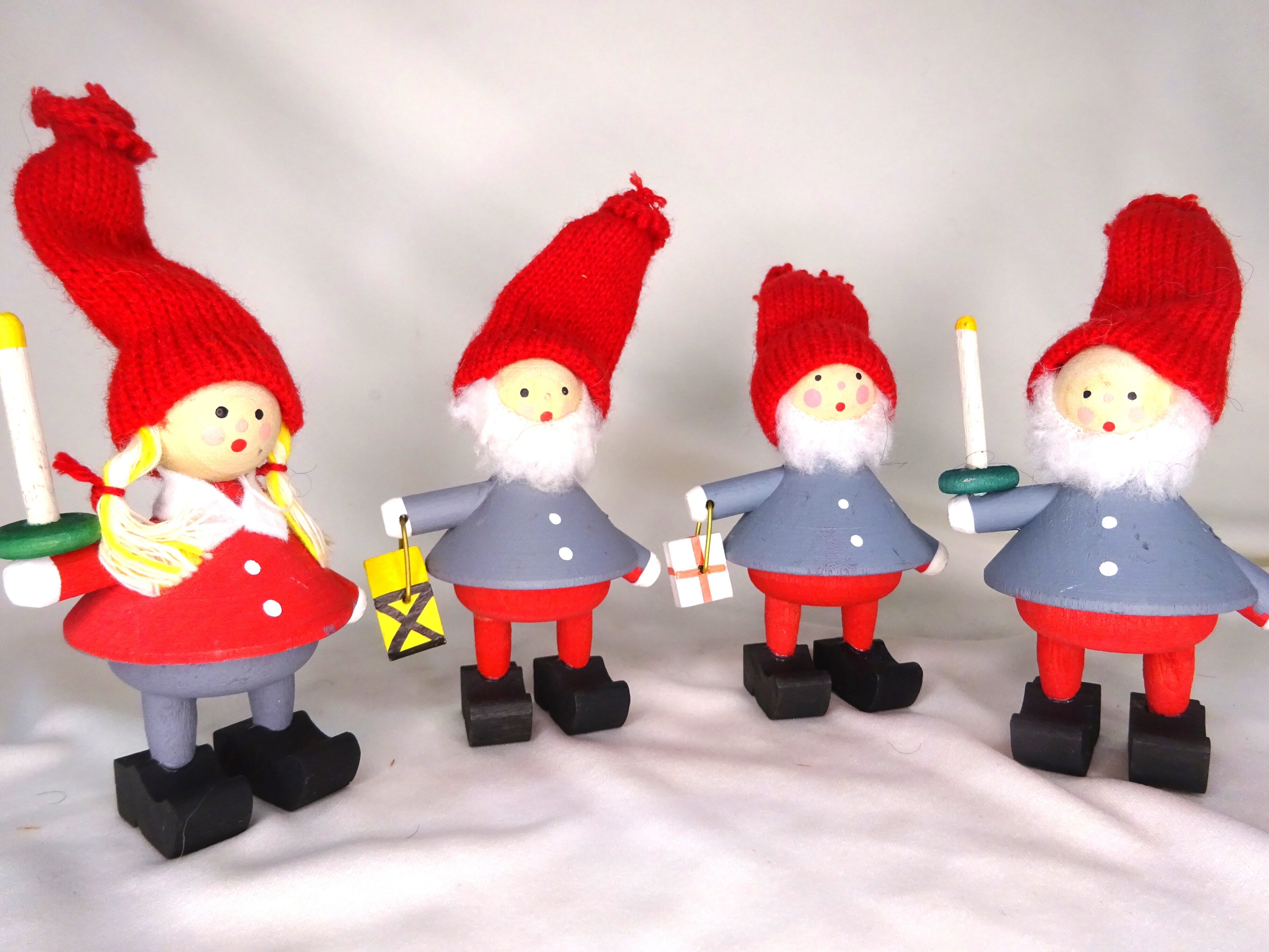 北欧の妖精トムテの木の人形です。家を守ったり、サンタさんのお手伝いをしたり、大忙し。でも、怒らせると・・・。今回は、やや小型のトムテを4ポーズご紹介します。