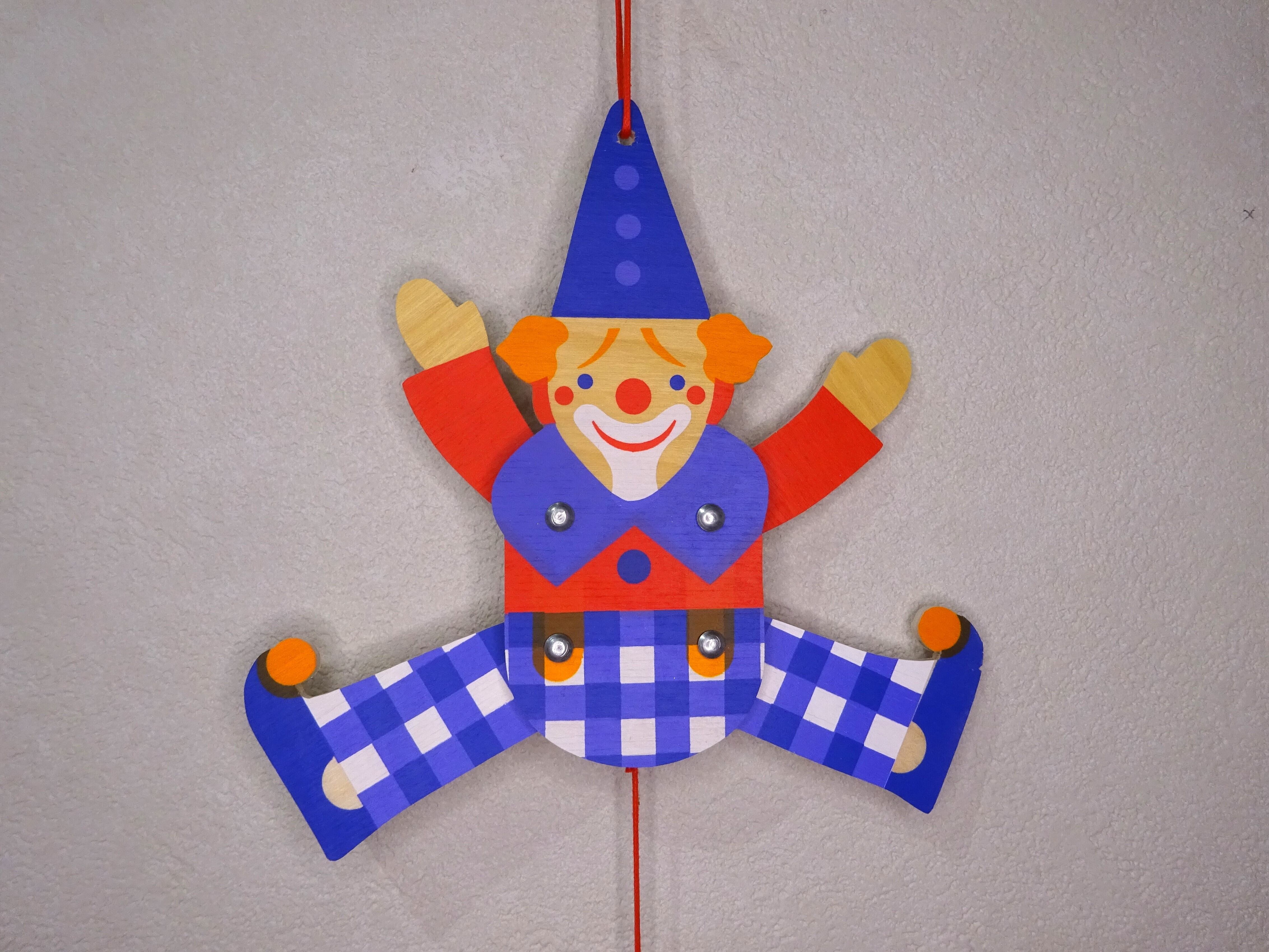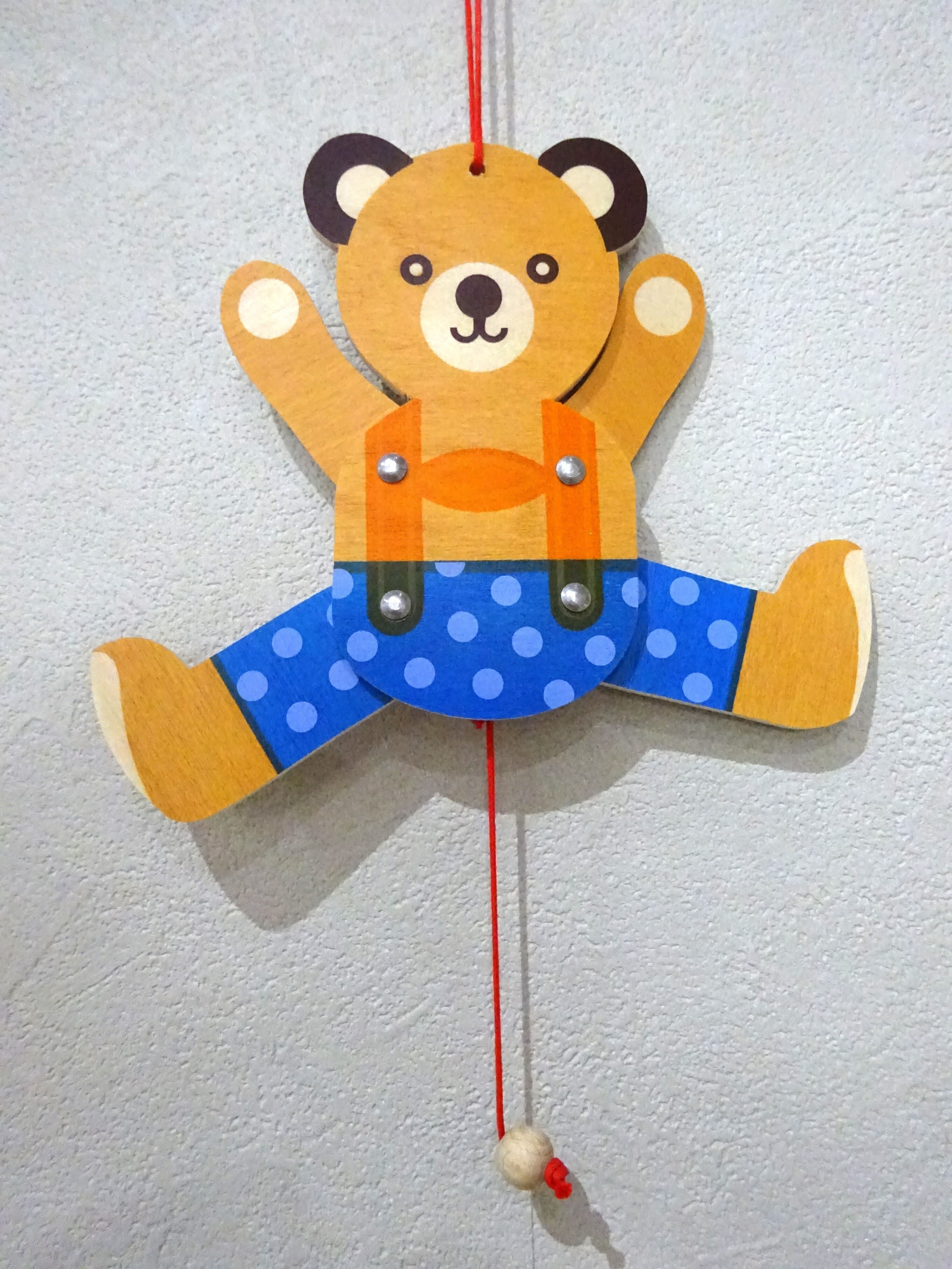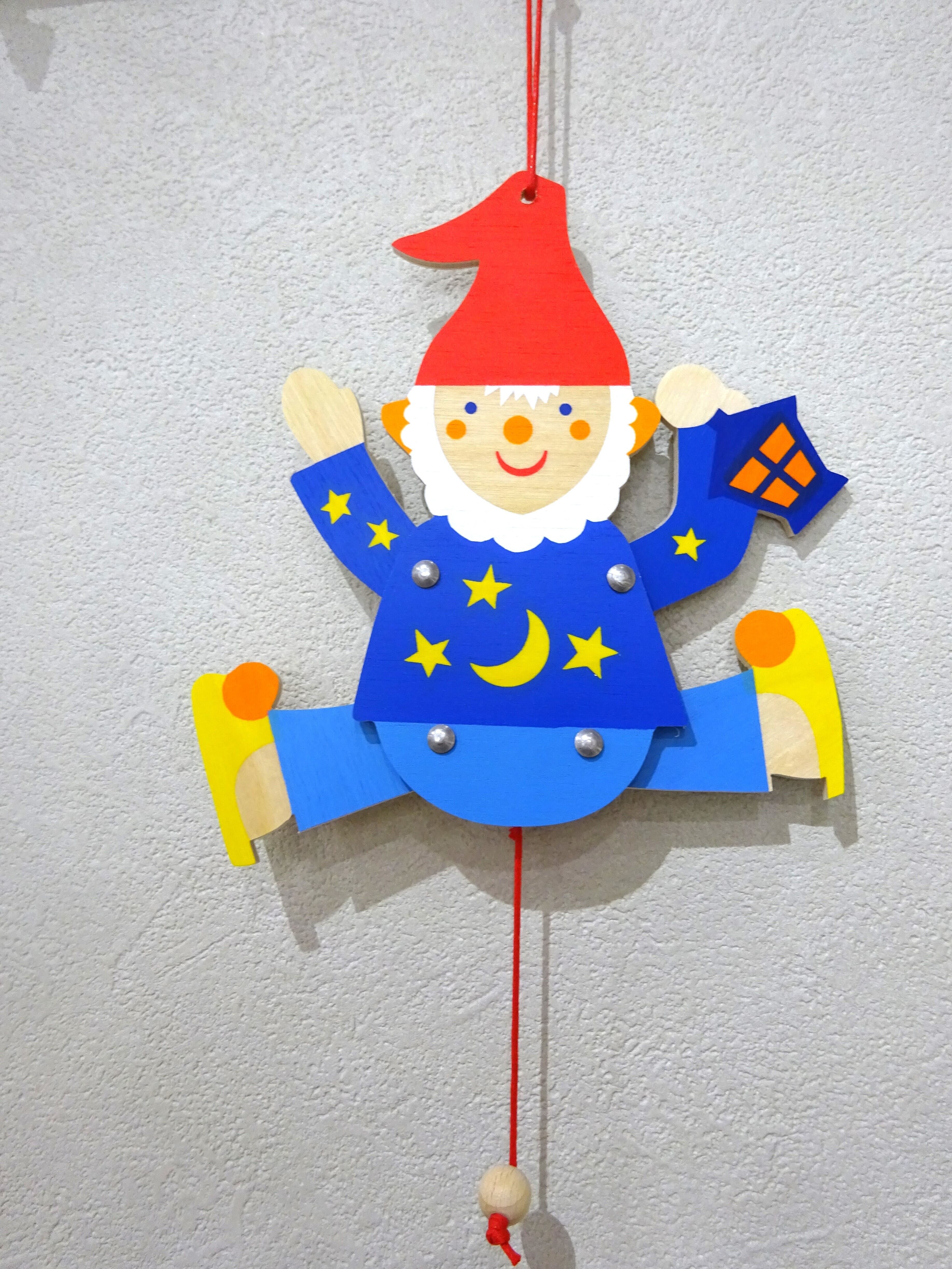 ひもをひっぱると、連動して手足がピョコンと動くハンぺルマン人形です。ドイツではおなじみの仕掛け玩具です。