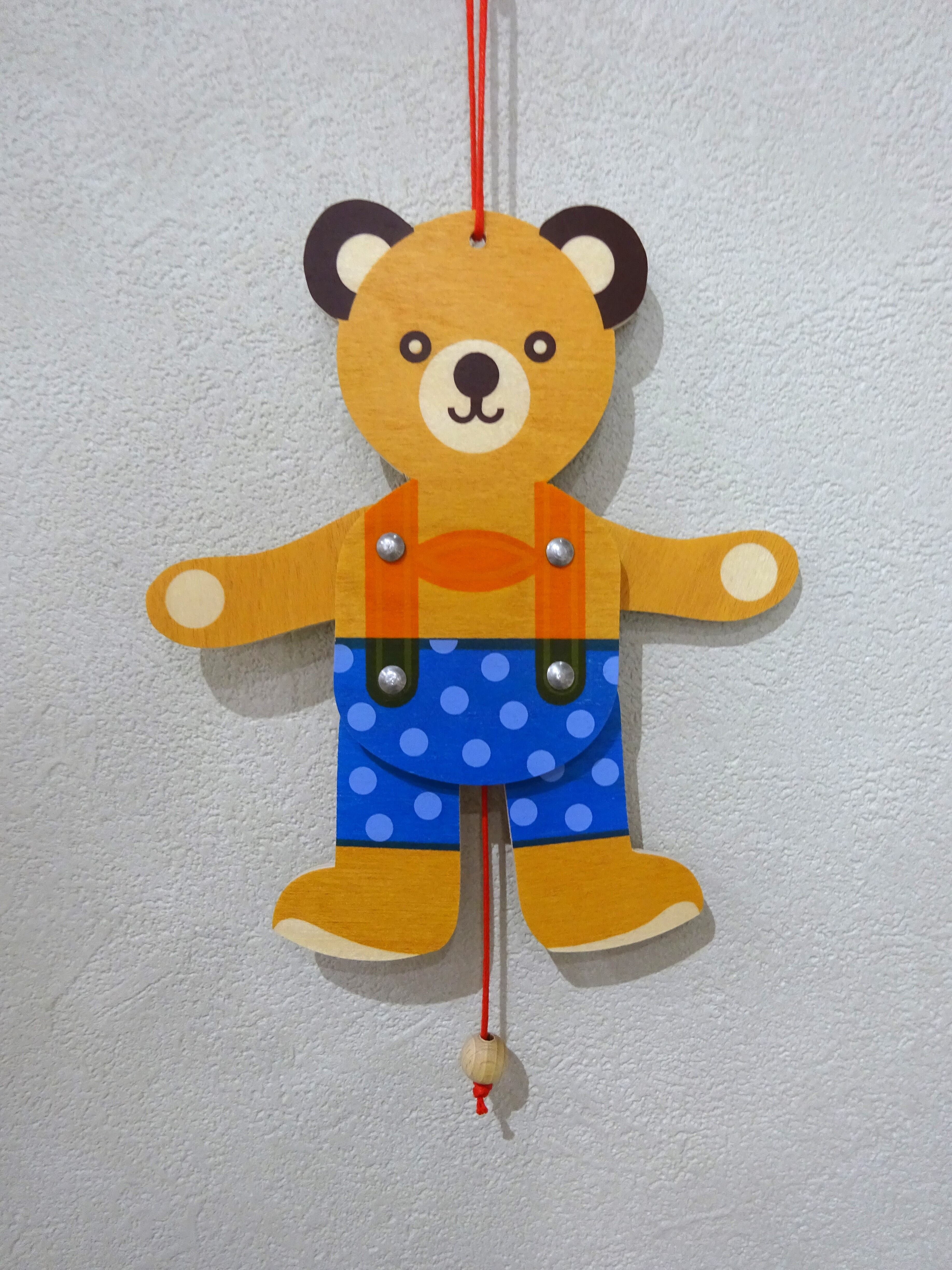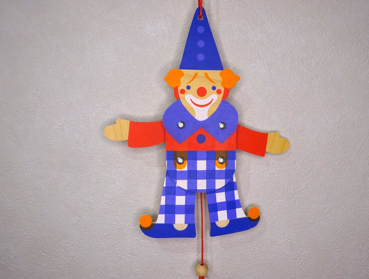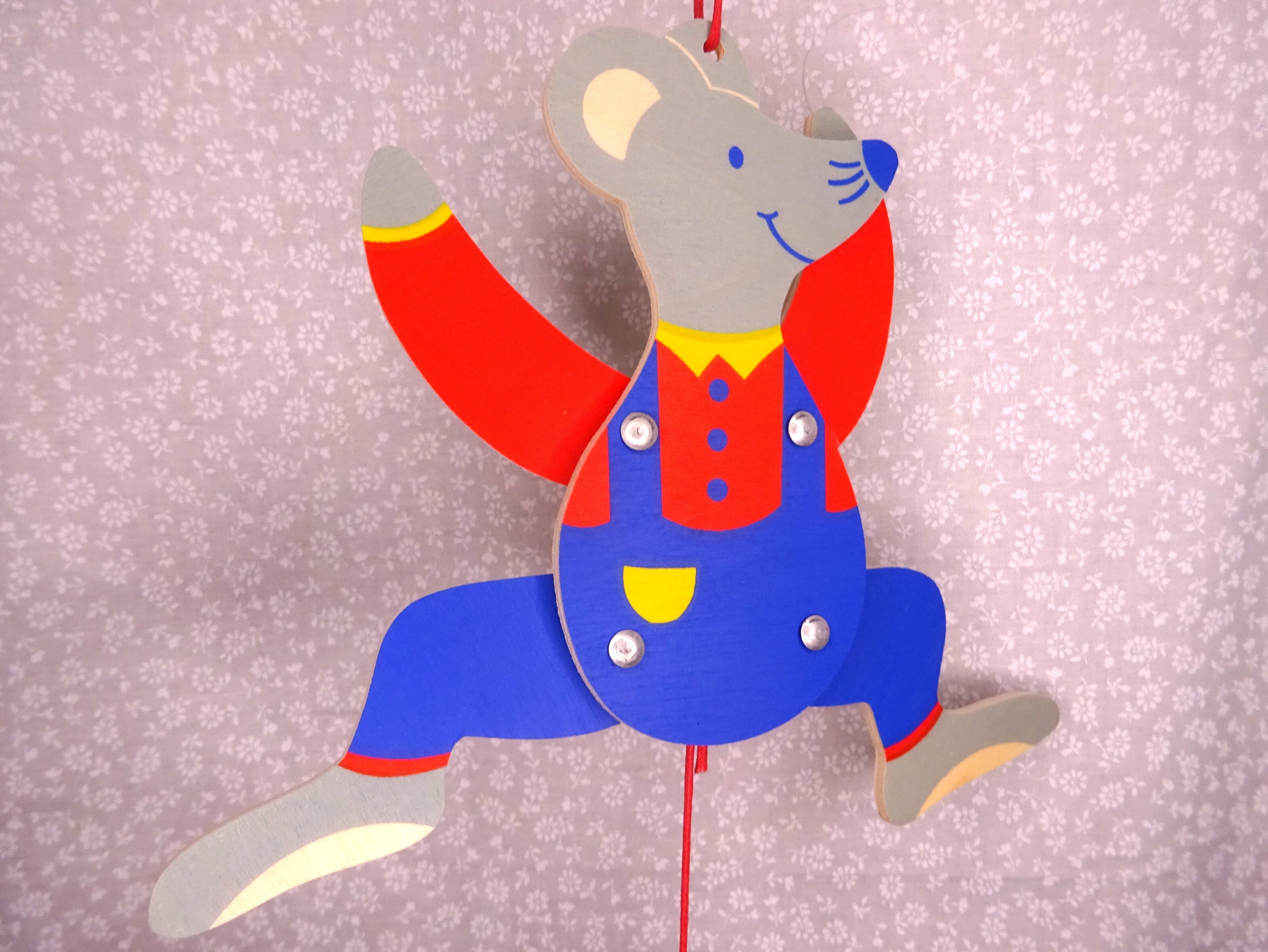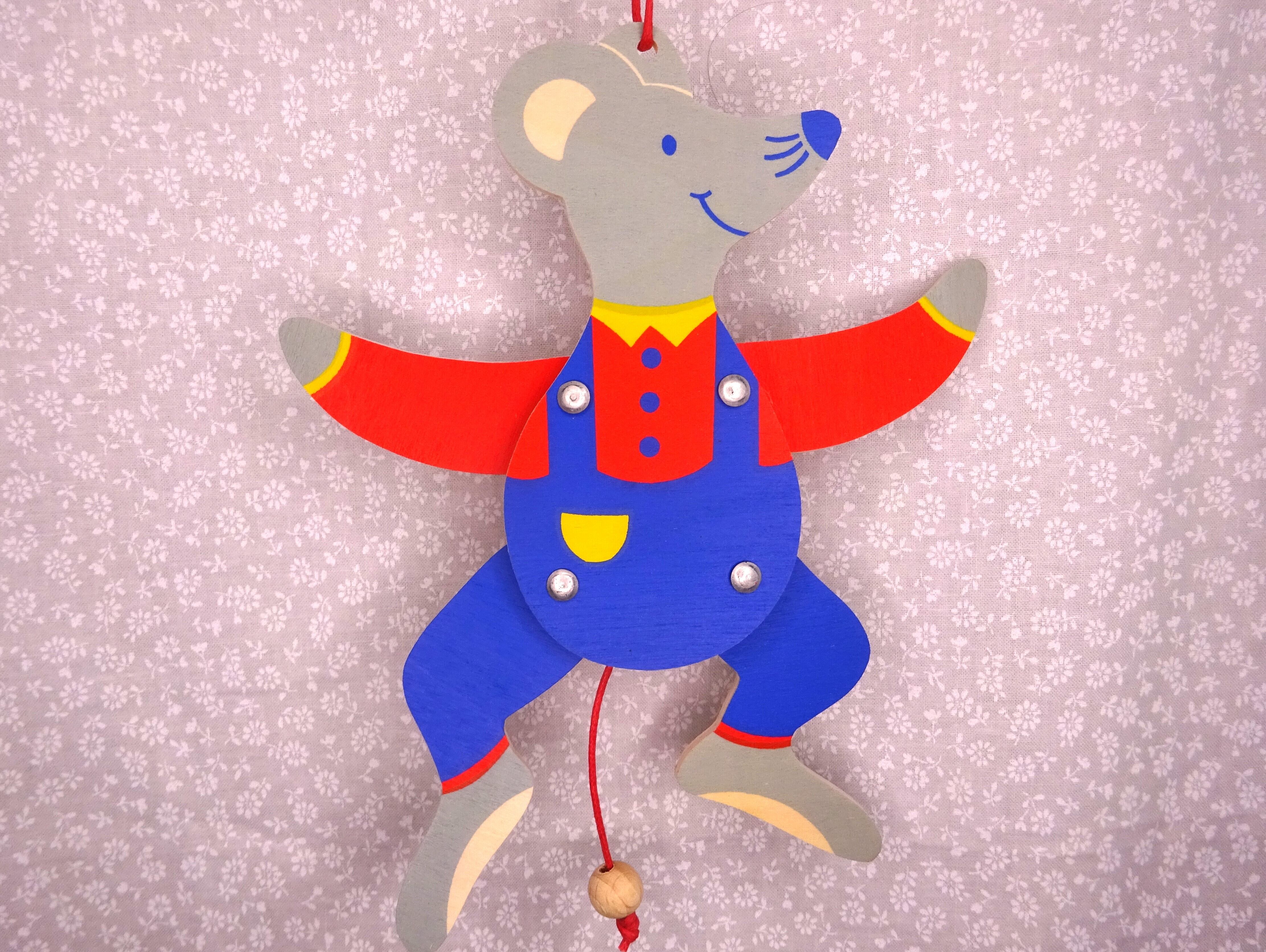 ひもをひっぱると、連動して手足がピョコンと動くハンぺルマン人形です。ドイツではおなじみの仕掛け玩具です。