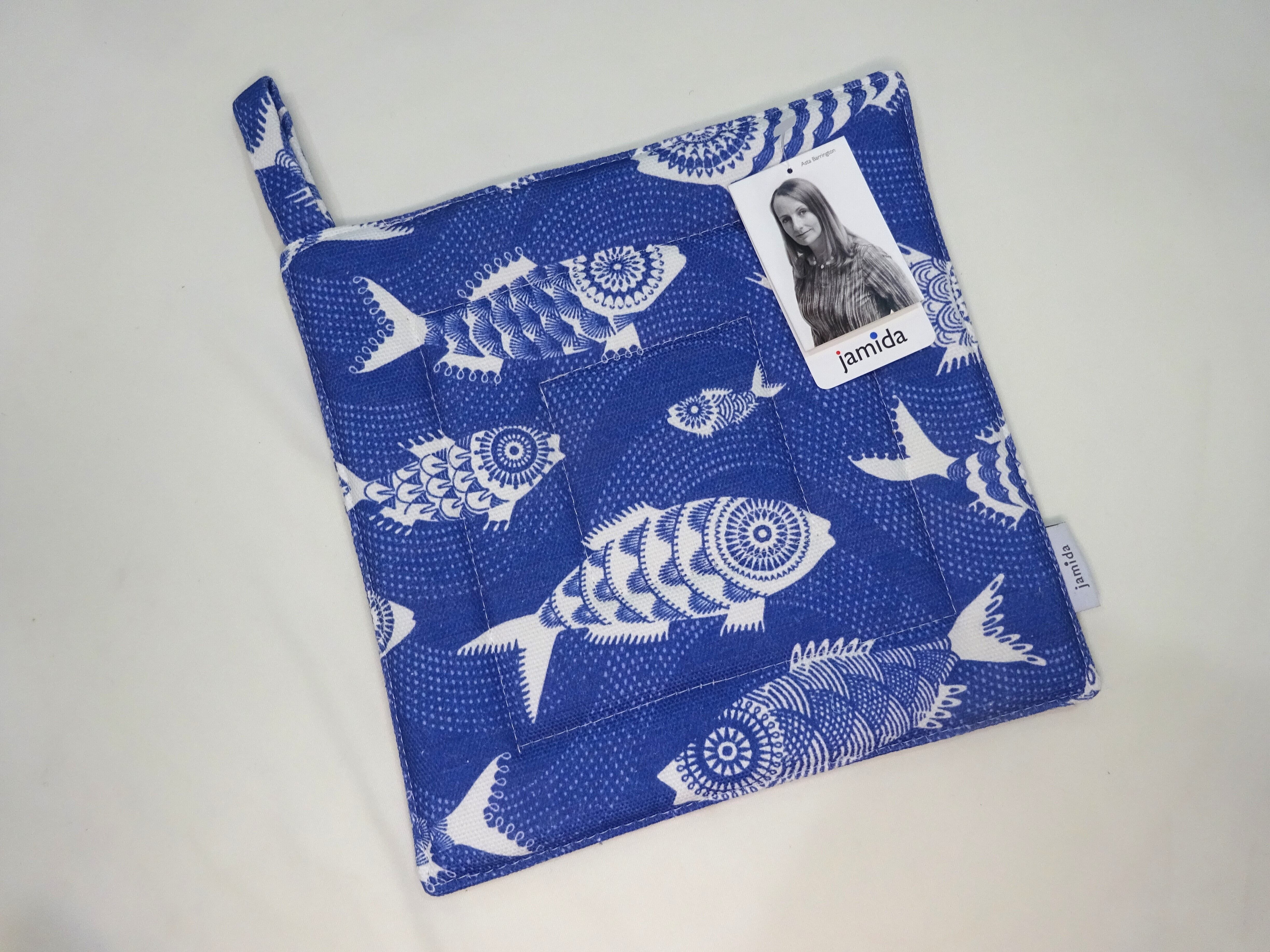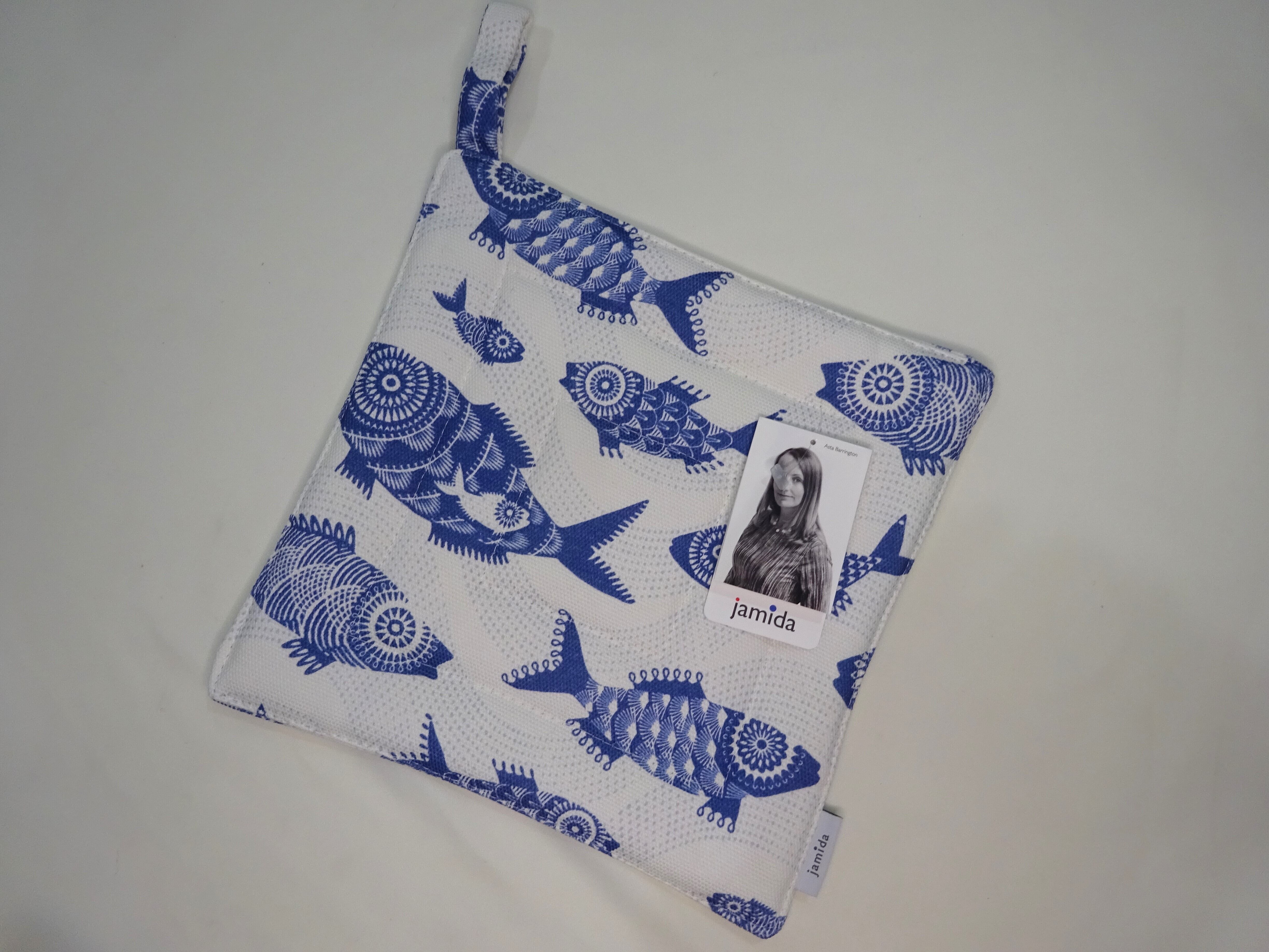 ここでのご紹介は、スウェーデンのAsta Barringtonの、目に特徴のある さかな と とり のデザイン柄の鍋掴みです。