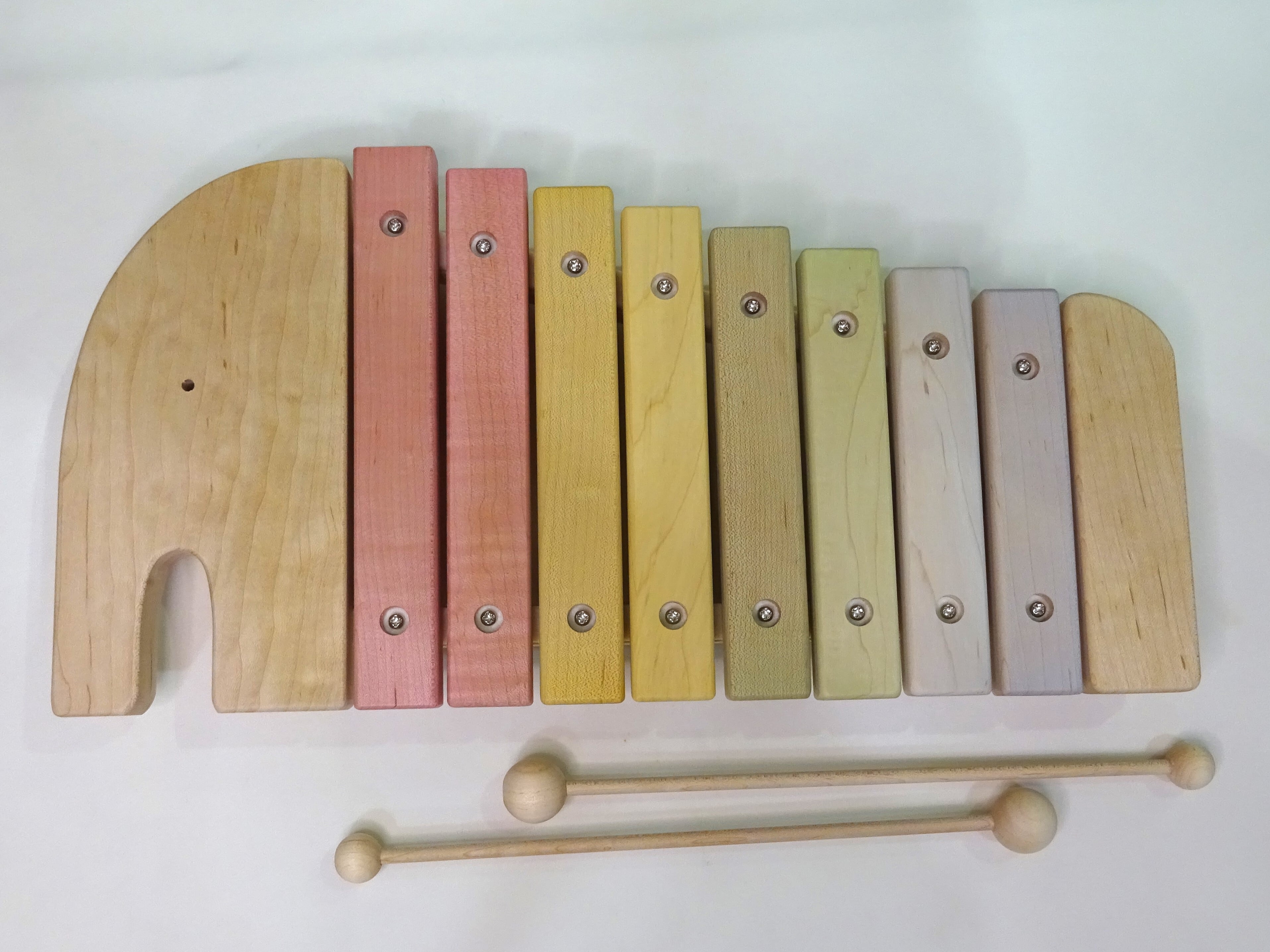 ぞうの形をしたやさしい色合いの木製のシロフォンです。木の乾いた心地よい音色を奏でます。職人さんが、音に配慮して、調整しています。