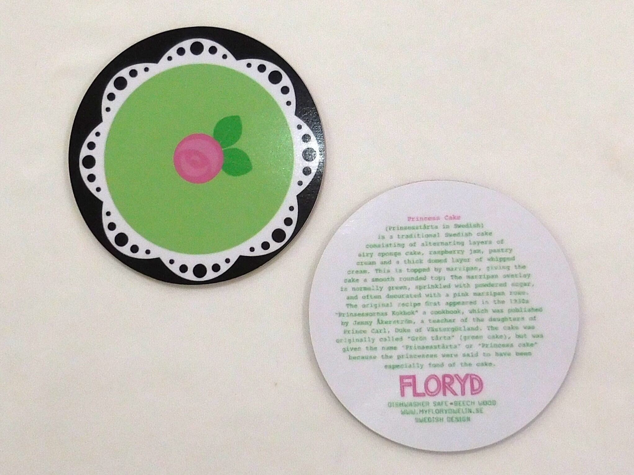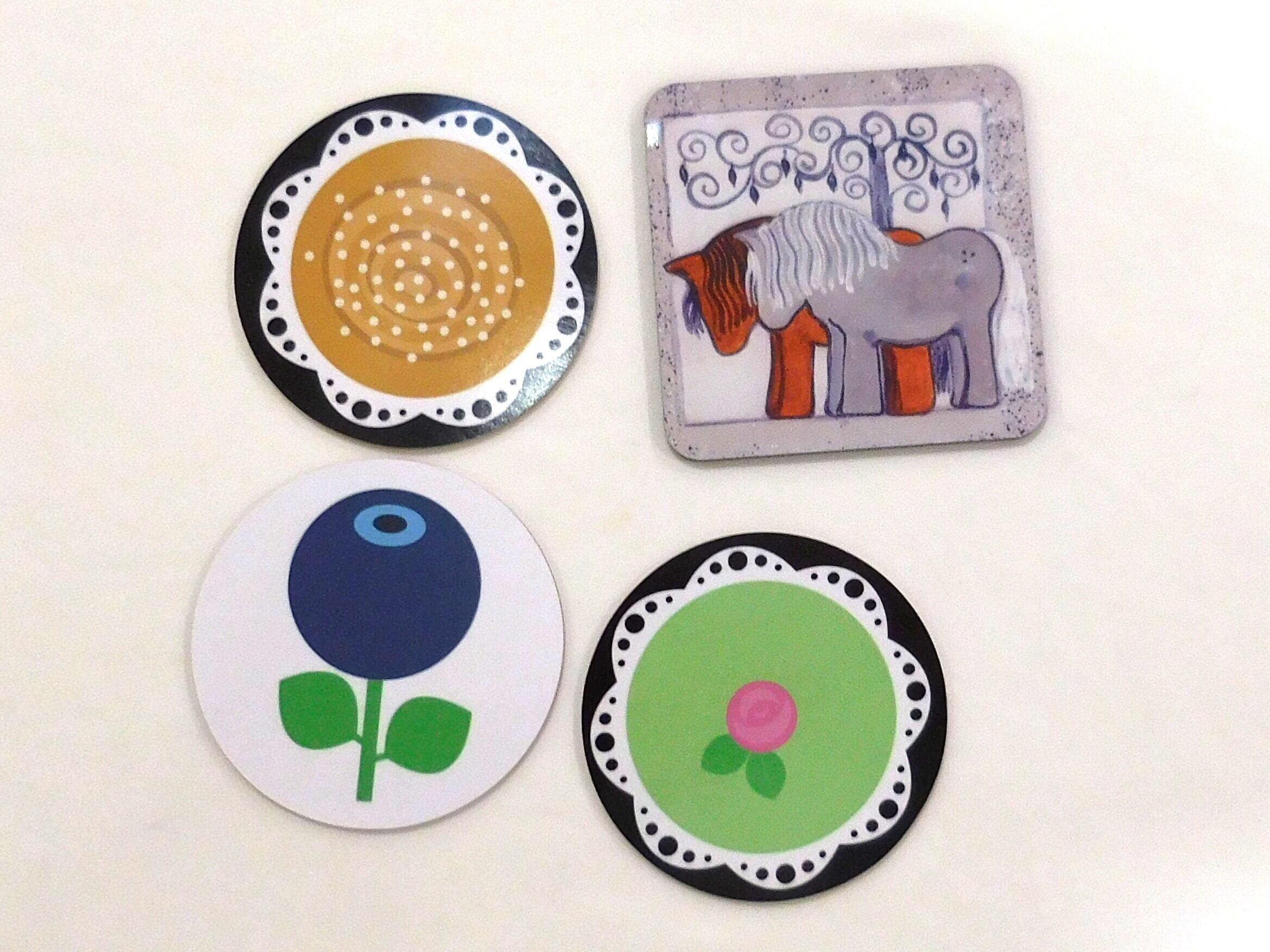 beech wood(ブナ科)の木の表面にイラストが描かれ、その裏面にその説明が載っている塗装された円形のコースターと、コルク地の片面に、うま2頭のイラストを描いた方形のコースターです。